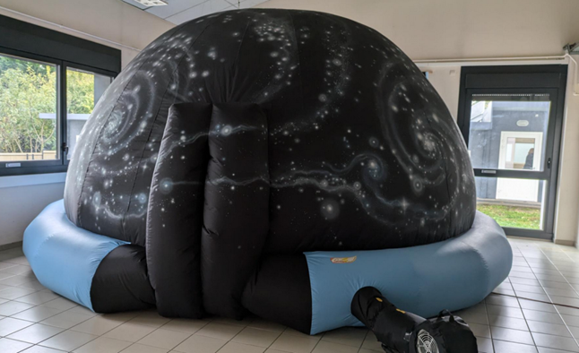 Le planétarium gonflable du Club d’Astronomie Lyon Ampère est venu s’installer dans la salle C08, pour le plus grand plaisir des premières du lycée. Ils ont ainsi pu voir un ciel sans nuage et sans pollution lumineuse et ainsi admirer la voie lactée et les constellations. Un petit voyage dans l’espace les a amené visiter les planètes du système solaire. Ils sont ensuite sortis de la galaxie pour la voir de loin. De quoi avoir le vertige ! Cette belle expérience a été permise grâce au financement du pass culture.